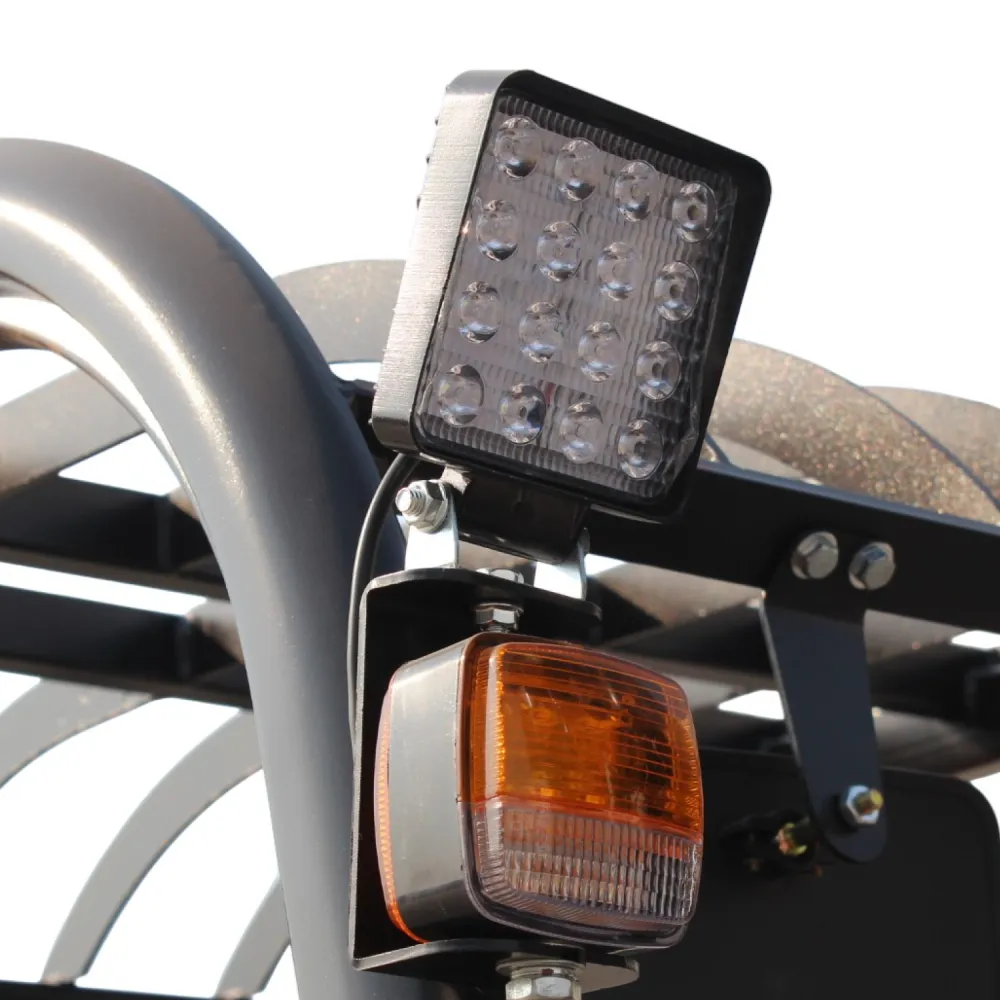 Прочные цельнолитые шины и четырёхколёсное исполнение делают погрузчик устойчивым на разных типах покрытий, включая бетон и асфальт. Радиус поворота 2200 мм и компактные габариты (длина с вилами 3300 мм, ширина 1096 мм) позволяют эффективно работать даже в стеснённых условиях склада.