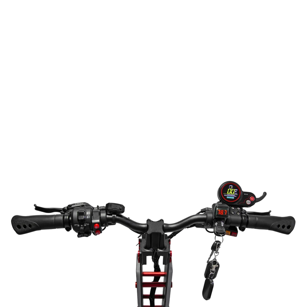 Два мотора по 250 Вт номиналом (пик 11000 Вт) дают разгон до 110 км/ч и подъем под 150 кг на 35°, 14" пневмоколеса с протектором гасят удары на бездорожье; литий-ионный аккумулятор 72V 50Ah обеспечивает реальный пробег 70-90 км в eco, 50-70 км в sport при 80 кг. Гидравлические дисковые тормоза останавливают за 4-5 м даже мокрые, режимы Eco/Turbo меняют баланс (Eco — 50 км/ч, 100+ км; Turbo — 110 км/ч, 50 км), энергоэффективность высока благодаря контроллеру с BMS. Зарядка 7 часов стандартная, быстрой нет, реальный пробег падает на 30% в холод.​​