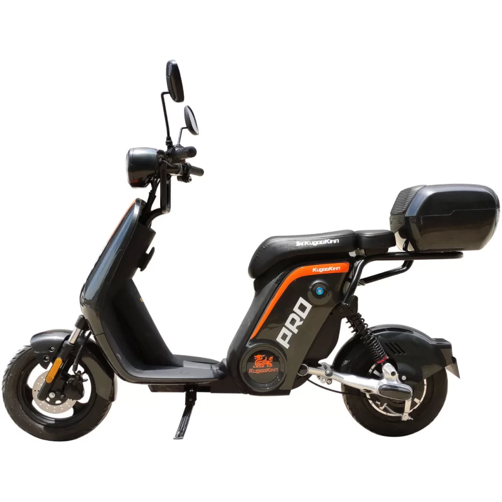 ЭЛЕКТРОСКУТЕР KUGOO V PRO 20 AH - мощный электроскутер в черном цвете выглядит серьезно и устрашающе в сравнении с предыдущей линейкой тс. Переливающееся под солнечными лучами лакокрасочное покрытие с брендовой надписью нравится продвинутым райдерам и новичкам. Модель, изготовленная с учетом пожеланий пользователей и наблюдений производителя, стала лидером продаж этого года. Купить электробайк выгодно, по приемлемой стоимости предлагает наш интернет-магазин.