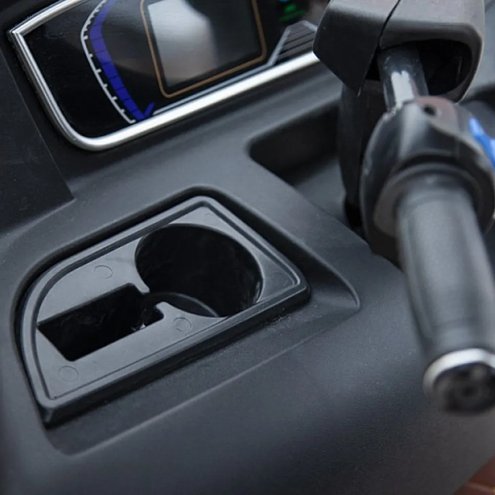 Удобство и комфорт езды обеспечены 2 мягкими анатомическими сиденьями. Наличие крыши позволяет спрятаться от негативного воздействия ультрафиолета и осадков. 12 дюймовые нактистые колеса способны преодолевать подъемы до 15 градусов, обеспечивать плавность езды по неровностям. Скорости контролируются с помощью ручки газа. Важные технические параметры с помощью бортового компьютера, размещенного на видимой части панели.