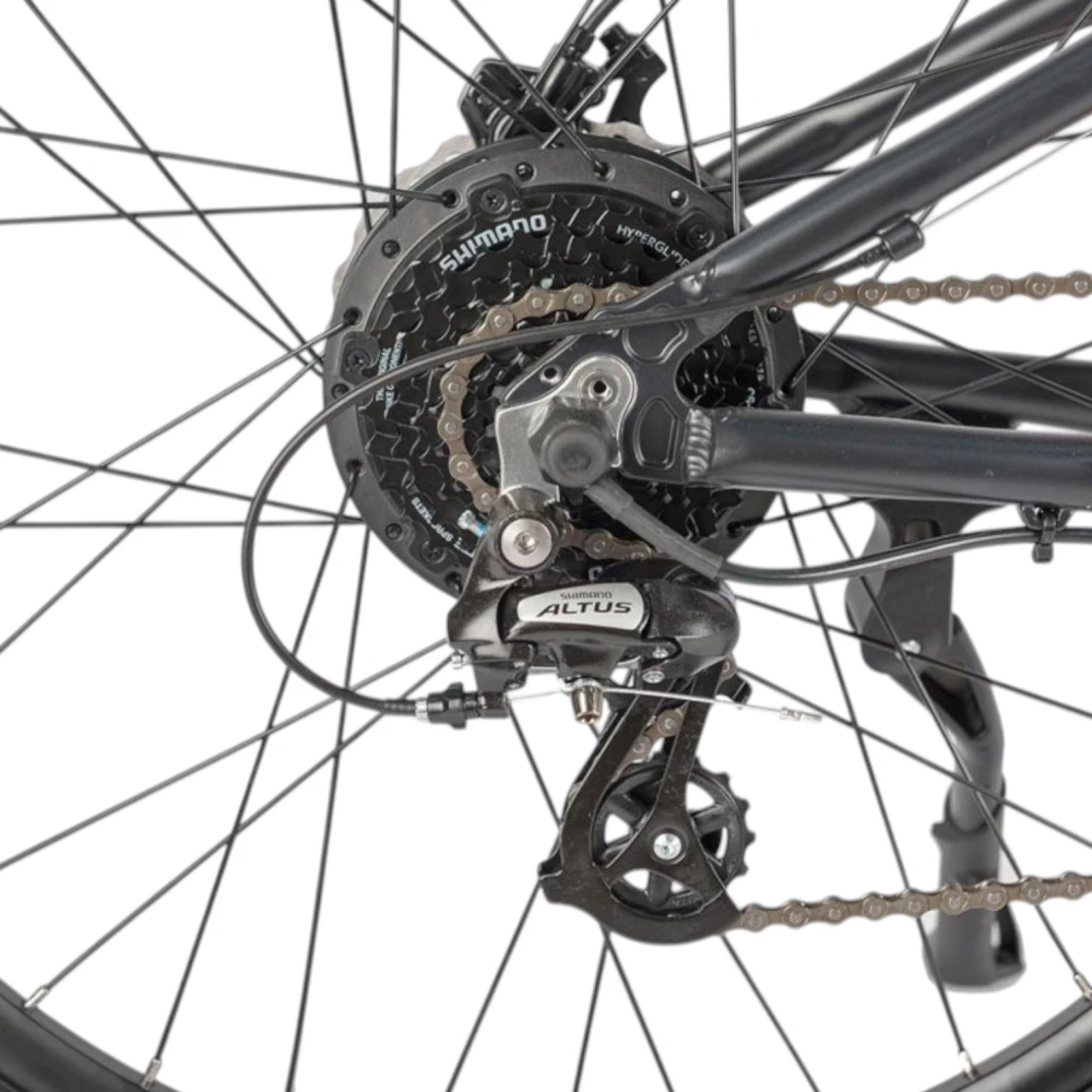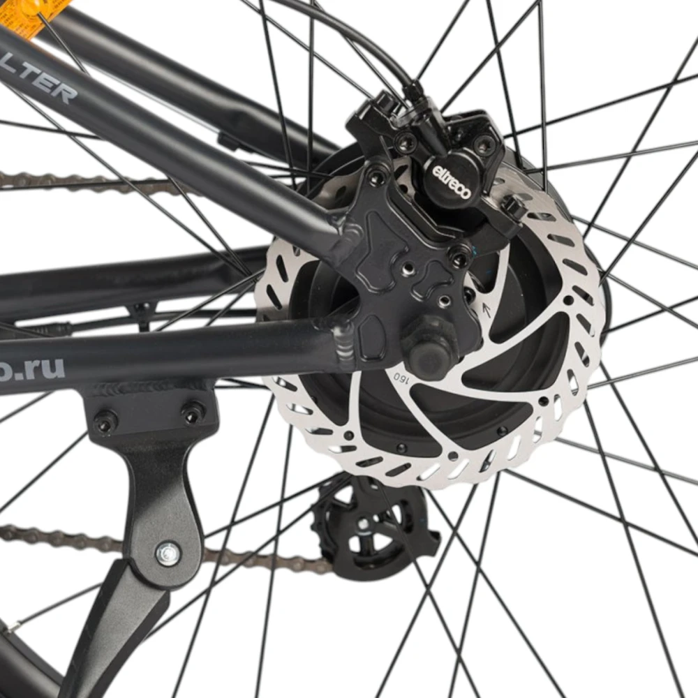 Ещё одна новинка этого года от компании Eltreco – двухподвесный электровелосипед  Walter. Новинка имеет актуальные 27,5-дюймовые колёса, которые позволяют с лёгкостью передвигаться по различным поверхностям, удобно преодолевать неровности рельефа и при этом дают велогибриду максимальную манёвренность. Прочная алюминиевая рама имеет в своей конструкции дополнительный амортизатор для усиления мягкости движения и интегрированную съёмную батарею. Также на велосипеде установлена амортизационная вилка с блокировкой хода для подбора наиболее удобного режима при поездке по разным рельефам. Велогибрид Walter имеет простую, но качественную 7-скоростную трансмиссию и практичные дисковые механические тормоза.