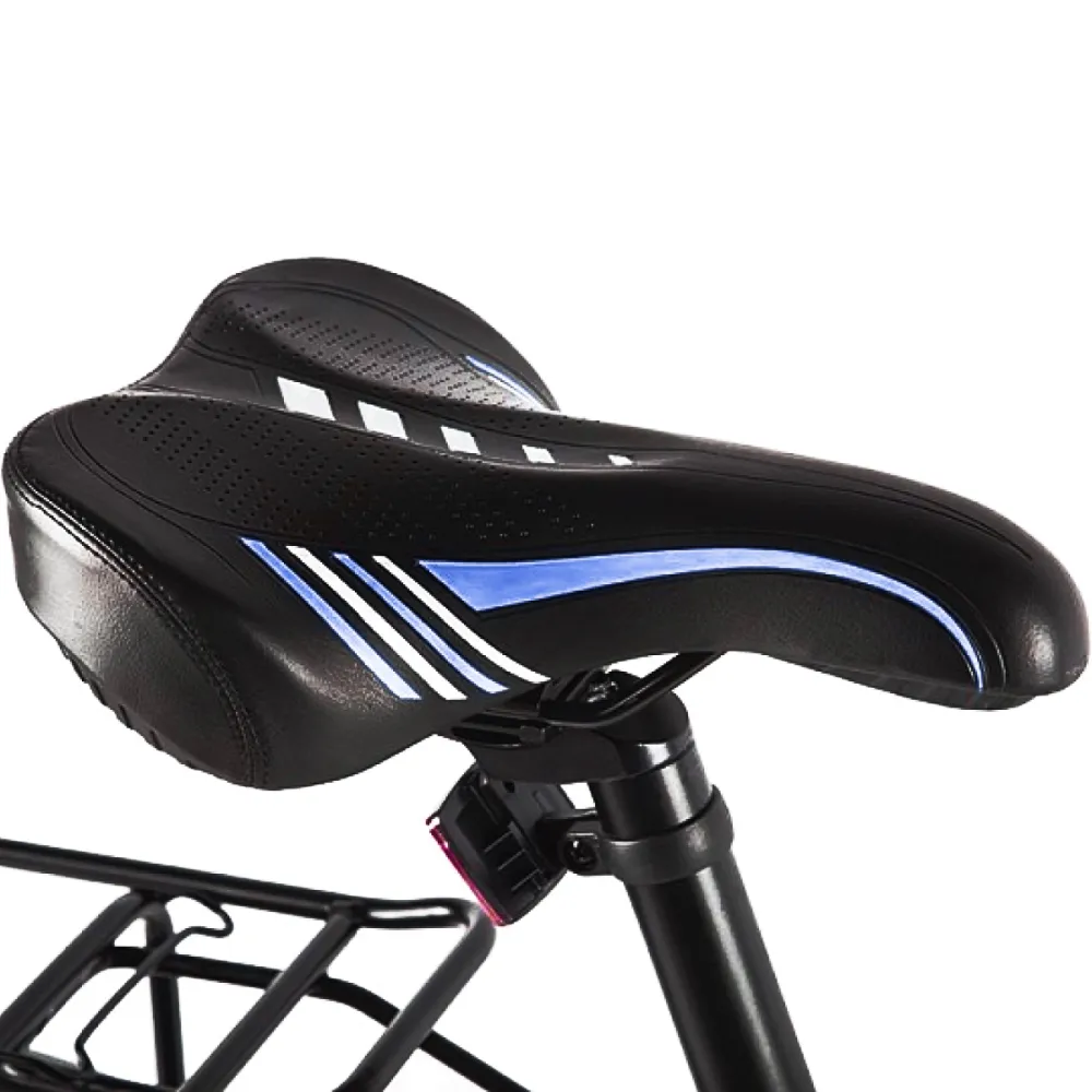 Аллюминевая рама выдерживает до 110 кг, сам велосипед весит 21 кг. Имеется амортизирующая подвеска.