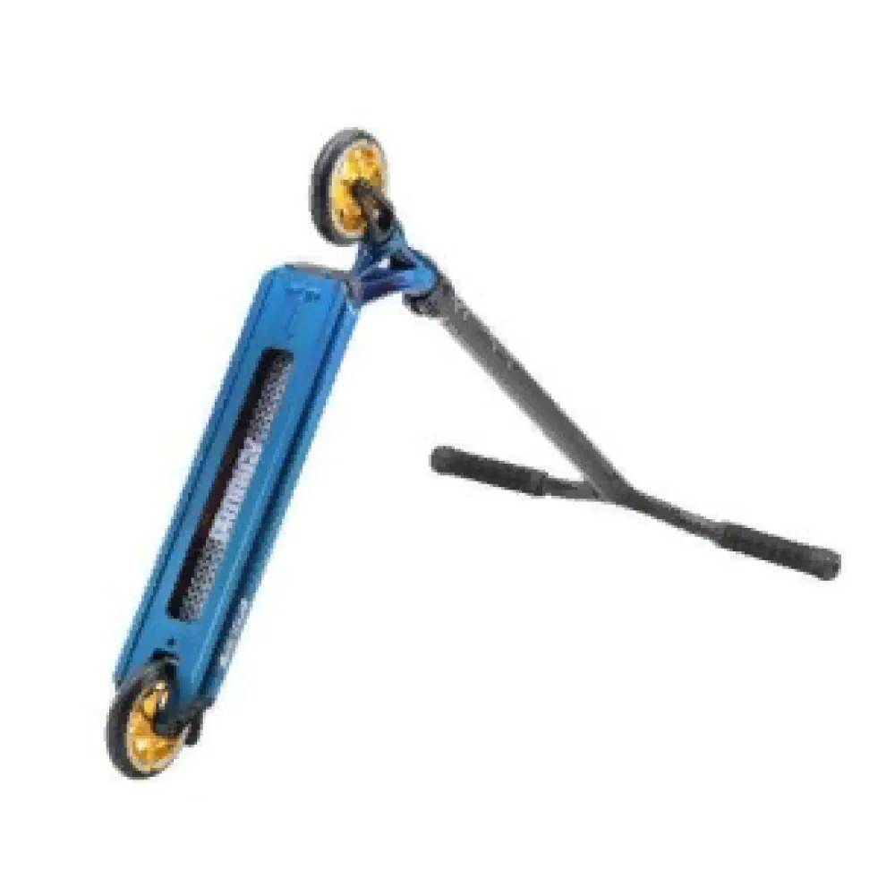 Самокат изготовлен из облегченного алюминия, весит 3,48 кг, долговечный в эксплуатации. Технические характеристики позволяют выполнять сложные трюки, прыжки, в том числе и с кручением. Нескользящая дека – широкая и устойчивая, исключает случайные падения и другие непредвиденные действия со стороны трюкача.
